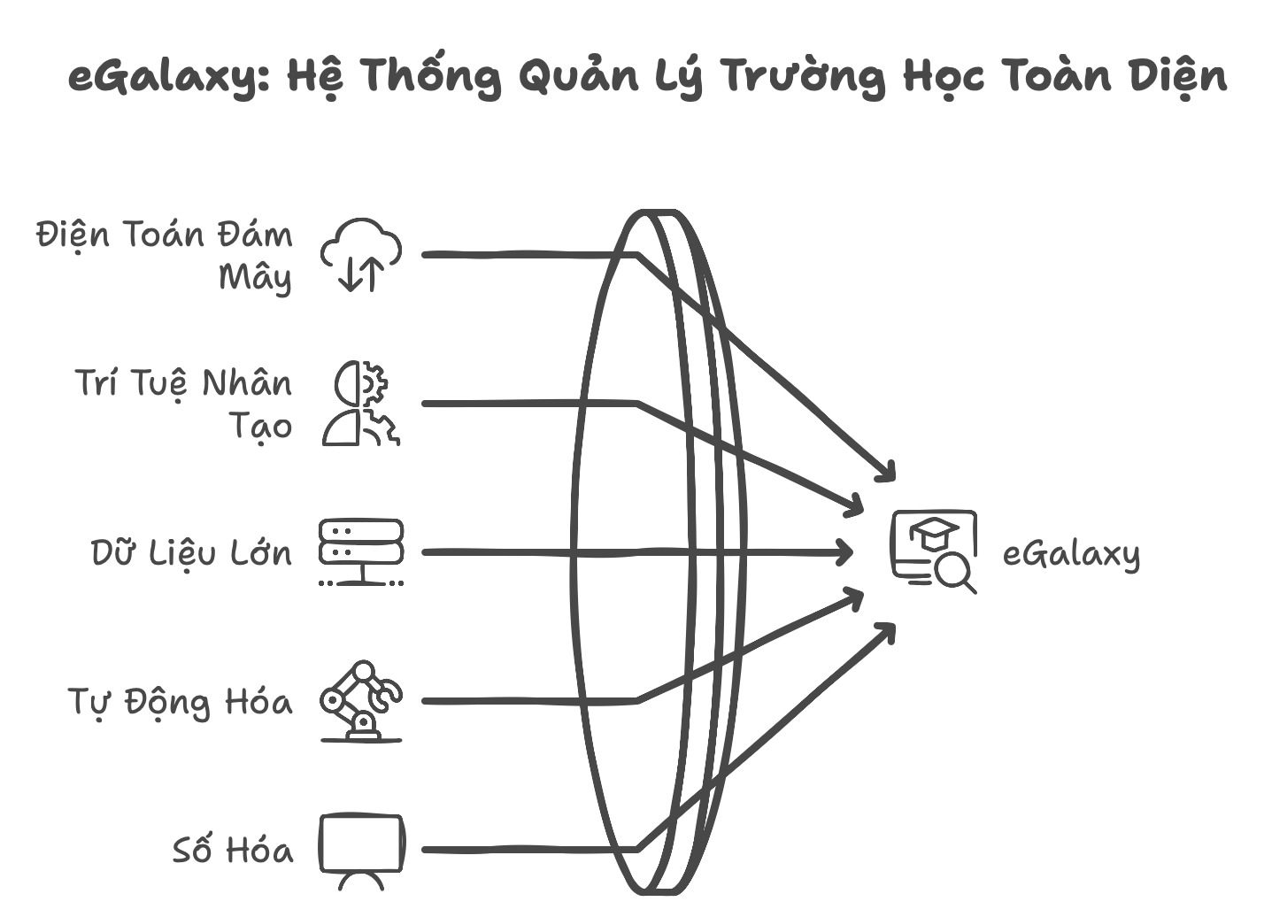 eGalaxy là một phần mềm quản lý trường học tiên tiến, được xây dựng trên nền tảng điện toán đám mây (Cloud computing) và tích hợp các công nghệ hiện đại như trí tuệ nhân tạo (AI) và dữ liệu lớn (Big Data). Nền tảng này cho phép các trường học và trung tâm giáo dục quản lý mọi hoạt động từ một giao diện duy nhất, cung cấp các công cụ mạnh mẽ để tự động hóa và số hóa quy trình quản lý, từ học viên, giáo viên, tài chính đến đào tạo.